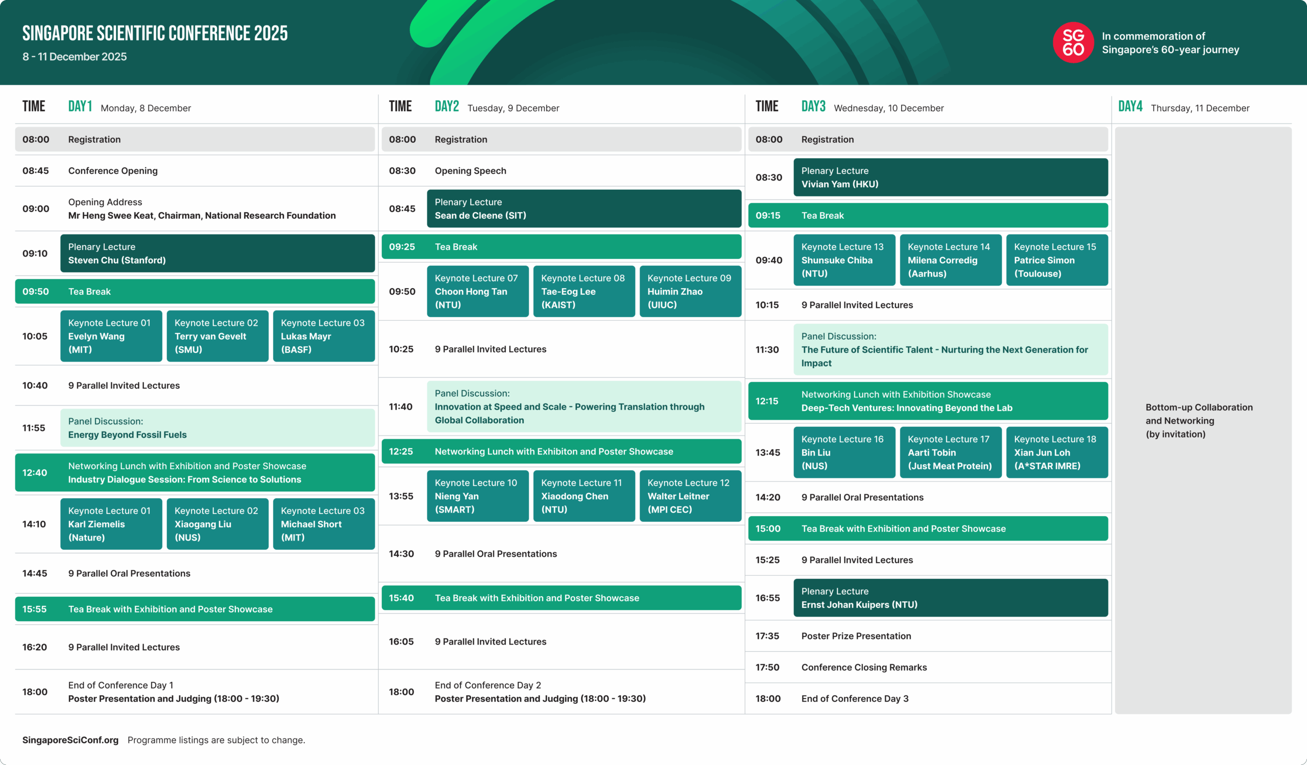 In commemoration of SG60, these sessions celebrate six decades of Singapore’s scientific progress and its journey towards a sustainable future. Explore how Singapore’s science and technology efforts drive sustainable impact. From coastal protection to future manufacturing, these sessions reveal the strategies and collaborations shaping a greener, smarter nation.